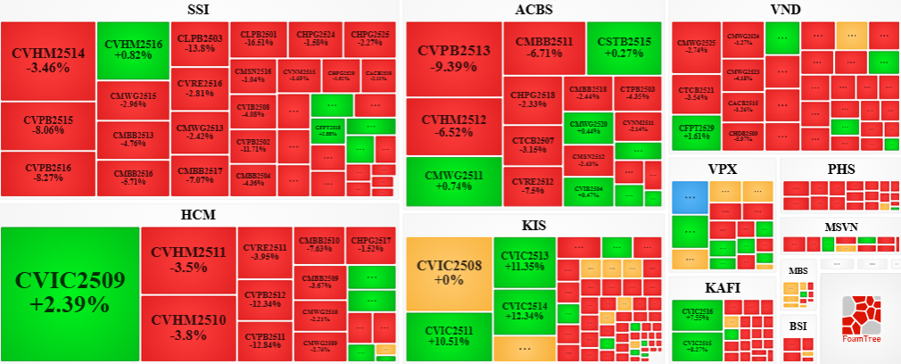 Trong phiên giao dịch ngày 09/12/2025, bên bán tiếp tục dẫn dắt thị trường khiến phần lớn các mã chứng quyền giảm giá. Cụ thể, các mã chứng quyền lớn trong nhóm giảm giá là CVHM2514, CVPB2513, CMBB2511 và CVRE2511.