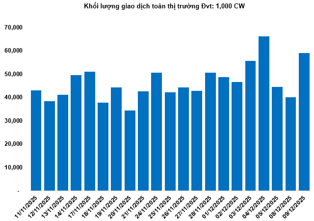 Thị trường chứng quyền ngày 10/12/2025: Khối lượng giao dịch toàn thị trường tăng hơn 47%