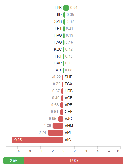 Kết thúc phiên giao dịch ngày 09/12/2025, toàn thị trường có 55 mã tăng, 194 mã giảm và 25 mã tham chiếu.