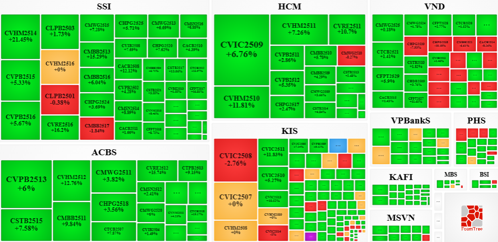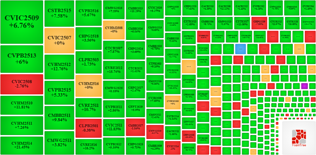 Trong phiên giao dịch ngày 12/11/2025, bên mua tiếp tục áp đảo thị trường khiến phần lớn các mã chứng quyền tăng giá. Cụ thể, các mã chứng quyền lớn trong nhóm tăng giá là CVIC2509, CVPB2513, CVHM2510 và CSTB2515.