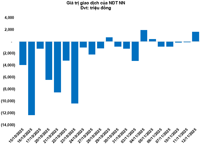 Kết thúc phiên giao dịch ngày 12/11/2025, toàn thị trường có 236 mã tăng, 43 mã giảm và 22 mã tham chiếu. Khối ngoại quay lại mua ròng với tổng mức mua ròng đạt 1.62 tỷ đồng.