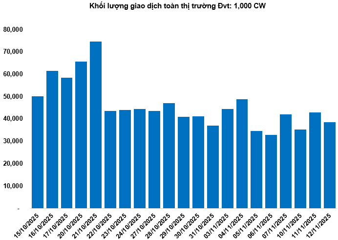 Khối lượng giao dịch toàn thị trường trong phiên 12/11 đạt 38.46 triệu CW, giảm 10.51%; giá trị giao dịch đạt 64.94 tỷ đồng, giảm 22.69% so với phiên 11/11. Trong đó, CMBB2518 là mã dẫn đầu thị trường về khối lượng và giá trị giao dịch, với tổng khối lượng đạt 4.6 triệu CW, tương đương giá trị 8.66 tỷ đồng.