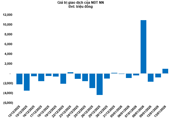 Kết thúc phiên giao dịch ngày 13/01/2026, toàn thị trường có 123 mã tăng, 102 mã giảm và 20 mã tham chiếu. Khối ngoại quay lại mua ròng với tổng mức mua ròng đạt 1.01 tỷ đồng.