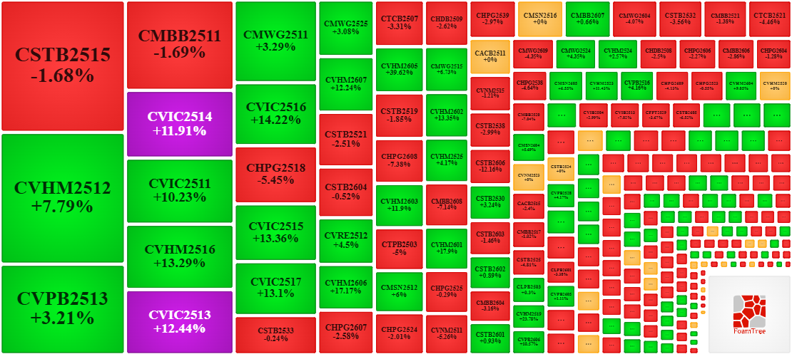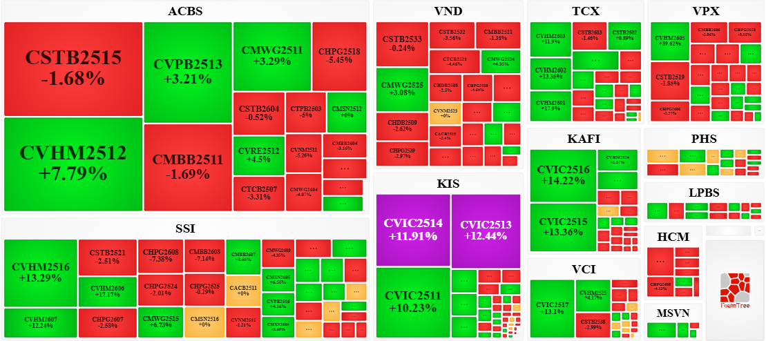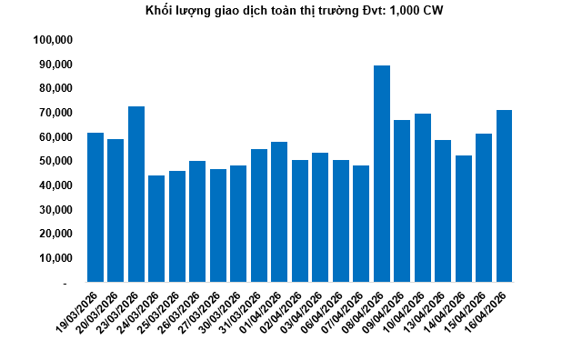 Khối lượng giao dịch toàn thị trường trong phiên 16/04 đạt 71.09 triệu CW, tăng 15.77%; giá trị giao dịch đạt 107.95 tỷ đồng, tăng 31.58% so với phiên 15/04. Trong đó, CVRE2512 là mã dẫn đầu thị trường về khối lượng và giá trị giao dịch, với tổng khối lượng đạt 2.63 triệu CW, tương đương giá trị 7.9 tỷ đồng.