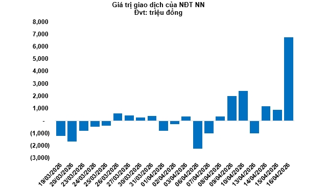 Kết thúc phiên giao dịch ngày 16/04/2026, toàn thị trường có 93 mã tăng, 143 mã giảm và 30 mã tham chiếu. Khối ngoại tiếp tục mua ròng với tổng mức mua ròng đạt 6.74 tỷ đồng.