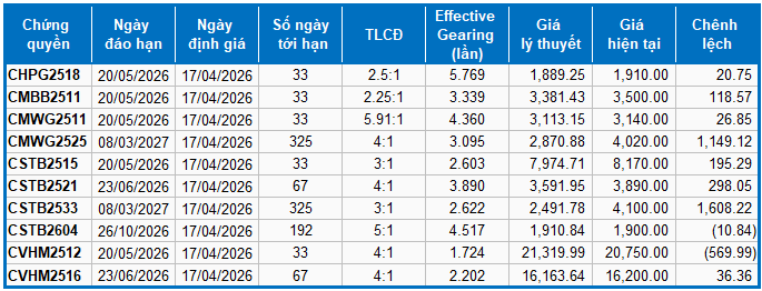 Dựa trên phương pháp định giá phù hợp với thời điểm khởi đầu là ngày 17/04/2026, mức giá hợp lý của 10 chứng quyền có vốn hóa lớn nhất và thanh khoản (giá trị và khối lượng khớp lệnh) vượt trội trong phiên được thể hiện như sau: