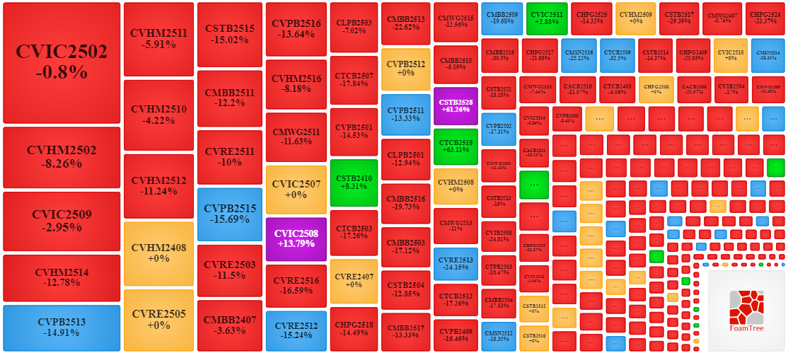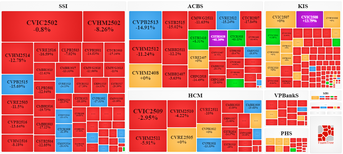 Trong phiên giao dịch ngày 20/10/2025, bên bán tiếp tục áp đảo thị trường khiến phần lớn các mã chứng quyền giảm giá. Cụ thể, các mã chứng quyền lớn trong nhóm giảm giá là CVIC2502, CVHM2502, CVIC2509, CVHM2514 và CVPB2513.