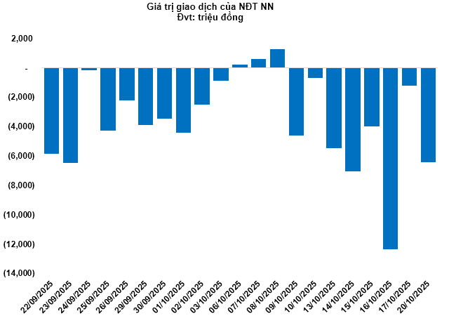 Kết thúc phiên giao dịch ngày 20/10/2025, toàn thị trường có 14 mã tăng, 218 mã giảm và 29 mã tham chiếu. Khối ngoại tiếp tục bán ròng với tổng mức bán ròng gần 6.42 tỷ đồng.