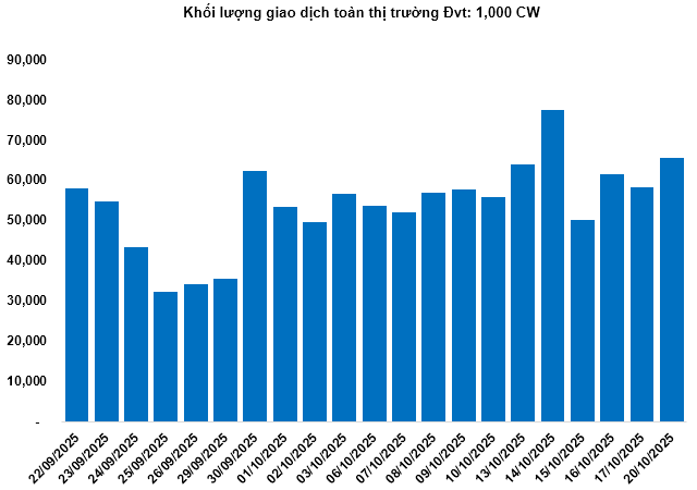 Khối lượng giao dịch toàn thị trường trong phiên 20/10 đạt 65.52 triệu CW, tăng 12.33%; giá trị giao dịch đạt 174.57 tỷ đồng, giảm 0.62% so với phiên 17/10. Trong đó, CMSN2509 là mã dẫn đầu thị trường về khối lượng với 2.31 triệu CW; CMSN2516 dẫn đầu về giá trị giao dịch với 6.06 tỷ đồng.