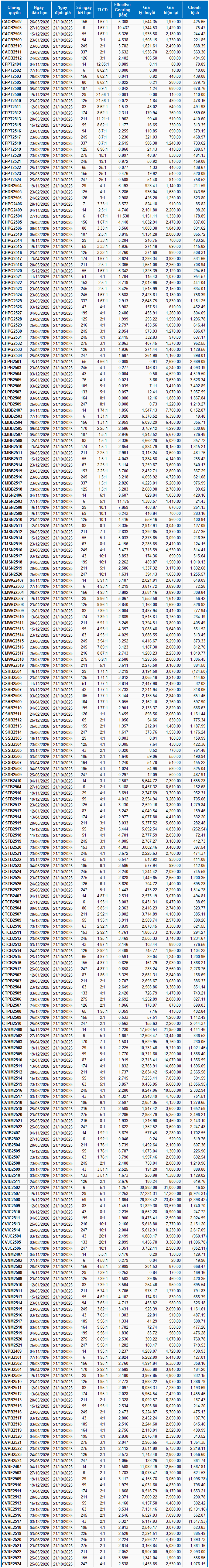 Dựa trên phương pháp định giá phù hợp với thời điểm khởi đầu là ngày 21/10/2025, mức giá hợp lý của các chứng quyền đang được giao dịch trên thị trường được thể hiện như sau: