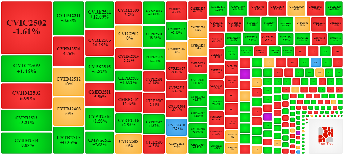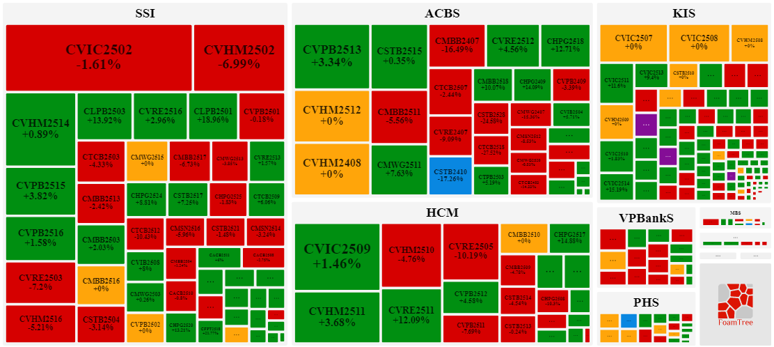 Trong phiên giao dịch ngày 21/10/2025, bên mua quay lại dẫn dắt thị trường khiến phần lớn các mã chứng quyền tăng giá. Cụ thể, các mã chứng quyền lớn trong nhóm tăng giá là CVIC2509, CVPB2513, CVHM2514, CVHM2511 và CSTB2515.