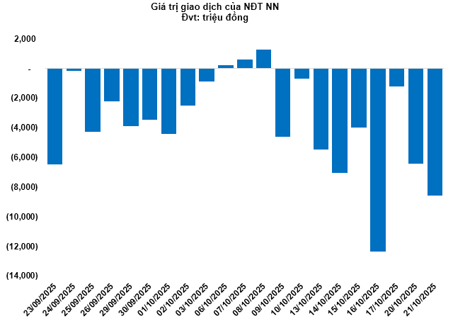 Kết thúc phiên giao dịch ngày 21/10/2025, toàn thị trường có 138 mã tăng, 99 mã giảm và 24 mã tham chiếu. Khối ngoại tiếp tục bán ròng với tổng mức bán ròng đạt 8.55 tỷ đồng.