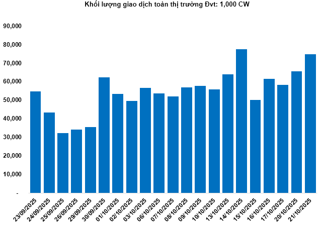 Khối lượng giao dịch toàn thị trường trong phiên 21/10 đạt 74.65 triệu CW, tăng 13.93%; giá trị giao dịch đạt 168.14 tỷ đồng, giảm 3.68% so với phiên 20/10. Trong đó, CHPG2520 là mã dẫn đầu thị trường về khối lượng và giá trị giao dịch, với tổng khối lượng đạt 3.67 triệu CW, tương đương giá trị 8.2 tỷ đồng.