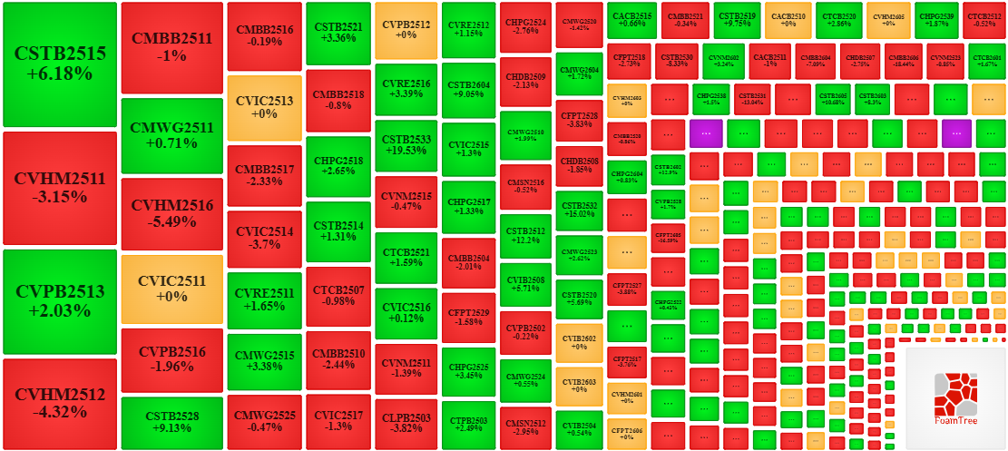 Khối lượng giao dịch toàn thị trường trong phiên 22/01 đạt 47.5 triệu CW, giảm 38.38%; giá trị giao dịch đạt 115.75 tỷ đồng, giảm 25.62% so với phiên 21/01. Trong đó, CMWG2521 là mã dẫn đầu thị trường về khối lượng với 2.49 triệu CW; CSTB2514 dẫn đầu về giá trị giao dịch với 15.08 tỷ đồng.