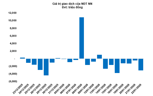 Kết thúc phiên giao dịch ngày 22/01/2026, toàn thị trường có 110 mã tăng, 165 mã giảm và 48 mã tham chiếu. Khối ngoại tiếp tục bán ròng với tổng mức bán ròng đạt 3.08 tỷ đồng.