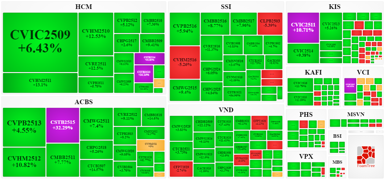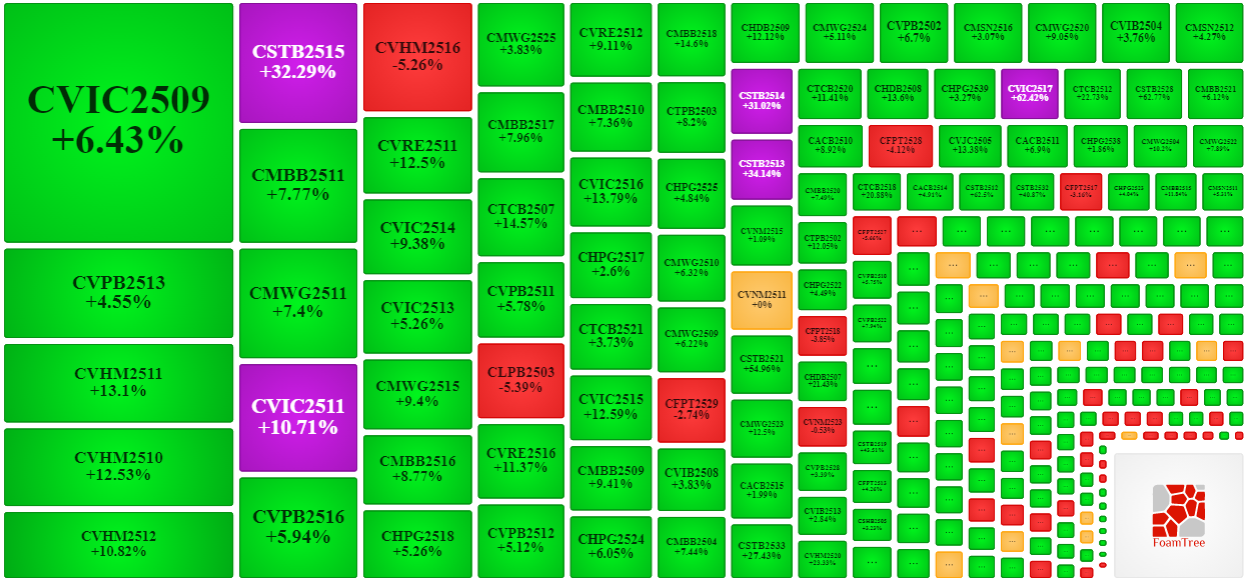 Trong phiên giao dịch ngày 22/12/2025, bên mua tiếp tục áp đảo thị trường khiến phần lớn các mã chứng quyền tăng giá. Cụ thể, các mã chứng quyền lớn trong nhóm tăng giá là CVIC2509, CVPB2513, CVHM2511 và CSTB2515.