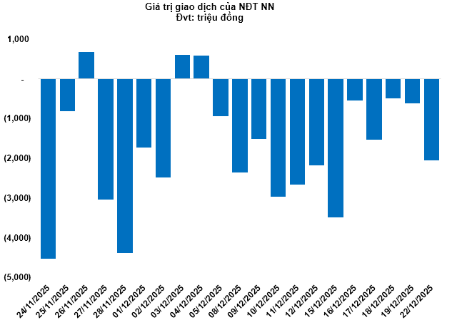 Kết thúc phiên giao dịch ngày 22/12/2025, toàn thị trường có 190 mã tăng, 52 mã giảm và 21 mã tham chiếu. Khối ngoại tiếp tục bán ròng với tổng mức bán ròng đạt 2.06 tỷ đồng.