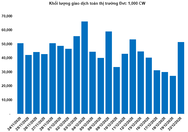 Khối lượng giao dịch toàn thị trường trong phiên 22/12 đạt 51.45 triệu CW, tăng 89.78%; giá trị giao dịch đạt 99 tỷ đồng, tăng 140.5% so với phiên 19/12. Trong đó, CVHM2525 là mã dẫn đầu thị trường về khối lượng và giá trị giao dịch, với tổng khối lượng đạt 3 triệu CW, tương đương giá trị 6.57 tỷ đồng.