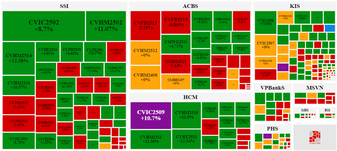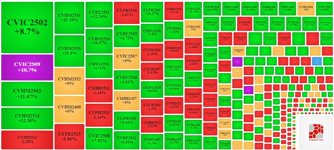Trong phiên giao dịch ngày 23/10/2025, bên mua quay lại dẫn dắt thị trường khiến phần lớn các mã chứng quyền tăng giá. Cụ thể, các mã chứng quyền lớn trong nhóm tăng giá là CVIC2502, CVIC2509, CVHM2502, CVHM2514, CVHM2511, CVHM2510 và CVRE2511.