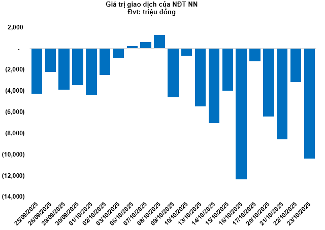 Kết thúc phiên giao dịch ngày 23/10/2025, toàn thị trường có 118 mã tăng, 109 mã giảm và 41 mã tham chiếu. Khối ngoại tiếp tục bán ròng với tổng mức bán ròng đạt 10.39 tỷ đồng.