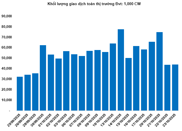 Khối lượng giao dịch toàn thị trường trong phiên 23/10 đạt 43.93 triệu CW, tăng 0.73%; giá trị giao dịch đạt 114.08 tỷ đồng, tăng 21.13% so với phiên 22/10. Trong đó, CMSN2503 là mã dẫn đầu thị trường về khối lượng với 1.9 triệu CW; CVHM2514 dẫn đầu về giá trị giao dịch với 10.03 tỷ đồng.