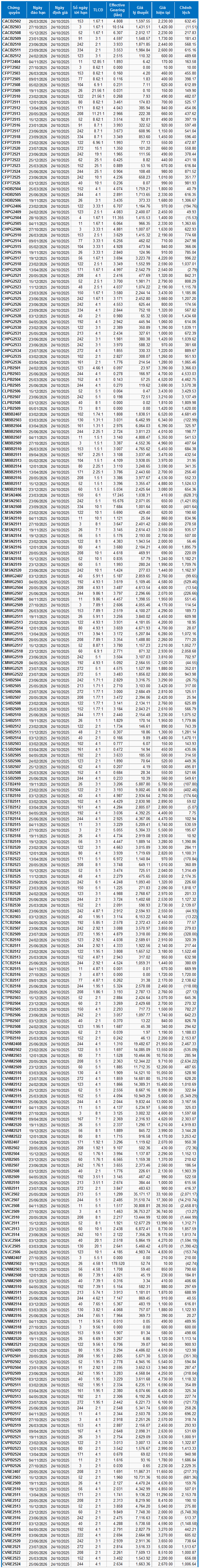 Dựa trên phương pháp định giá phù hợp với thời điểm khởi đầu là ngày 24/10/2025, mức giá hợp lý của các chứng quyền đang được giao dịch trên thị trường được thể hiện như sau: