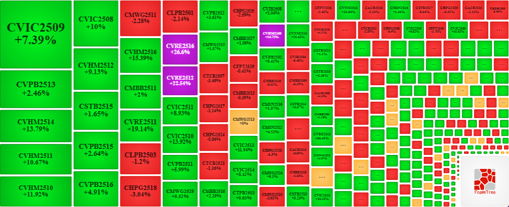 Trong phiên giao dịch ngày 24/11/2025, bên mua quay lại dẫn dắt thị trường khiến phần lớn các mã chứng quyền tăng giá. Cụ thể, các mã chứng quyền lớn trong nhóm tăng giá là CVIC2509, CVPB2513, CVHM2514 và CVRE2511.