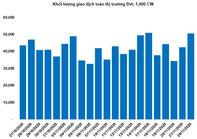 Khối lượng giao dịch toàn thị trường trong phiên 24/11 đạt 50.53 triệu CW, tăng 18.87%; giá trị giao dịch đạt 95.23 tỷ đồng, tăng 23.44% so với phiên 21/11. Trong đó, CHPG2535 là mã dẫn đầu thị trường về khối lượng và giá trị giao dịch, với tổng khối lượng đạt 4.9 triệu CW, tương đương giá trị 5.06 tỷ đồng.