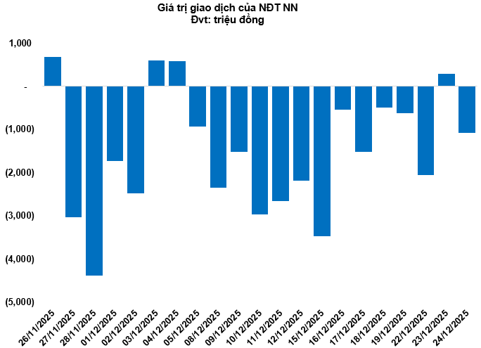 Kết thúc phiên giao dịch ngày 24/12/2025, toàn thị trường có 136 mã tăng, 96 mã giảm và 27 mã tham chiếu. Khối ngoại quay lại bán ròng với tổng mức bán ròng đạt 1.08 tỷ đồng.