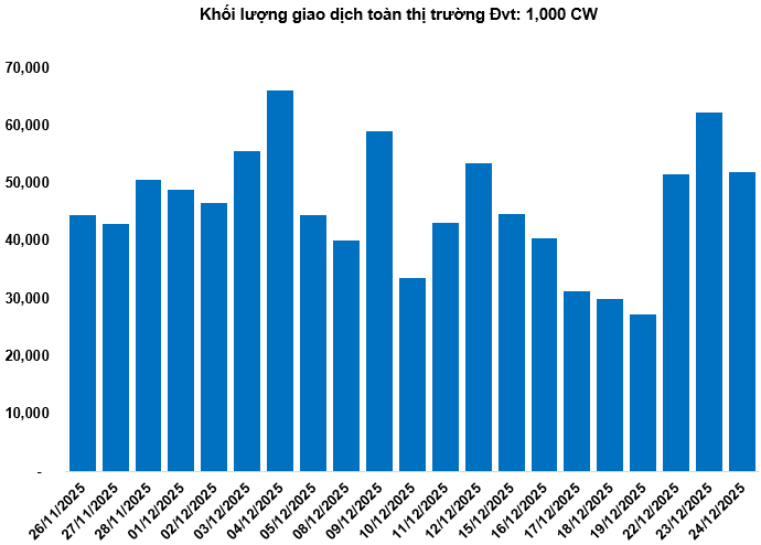Khối lượng giao dịch toàn thị trường trong phiên 24/12 đạt 51.9 triệu CW, giảm 16.45%; giá trị giao dịch đạt 102 tỷ đồng, giảm 22.77% so với phiên 23/12. Trong đó, CSTB2528 là mã dẫn đầu thị trường về khối lượng và giá trị giao dịch, với tổng khối lượng đạt 2.78 triệu CW, tương đương giá trị 8.15 tỷ đồng.