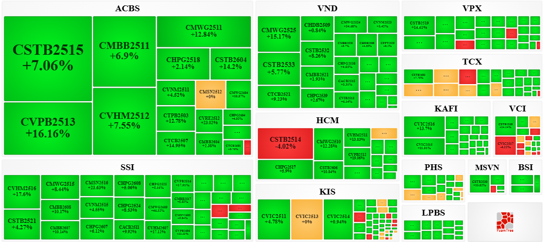 Trong phiên giao dịch ngày 25/03/2026, bên mua tiếp tục dẫn dắt thị trường khiến phần lớn các mã chứng quyền tăng giá. Cụ thể, các mã chứng quyền lớn trong nhóm tăng giá là CSTB2515, CVPB2513, CMBB2511, CVHM2512 và CMWG2511.