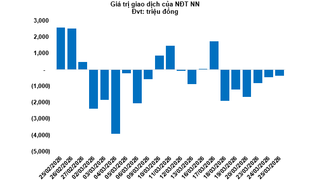 Kết thúc phiên giao dịch ngày 25/03/2026, toàn thị trường có 224 mã tăng, 27 mã giảm và 31 mã tham chiếu. Khối ngoại tiếp tục bán ròng với tổng mức bán ròng đạt 384.93 triệu đồng.