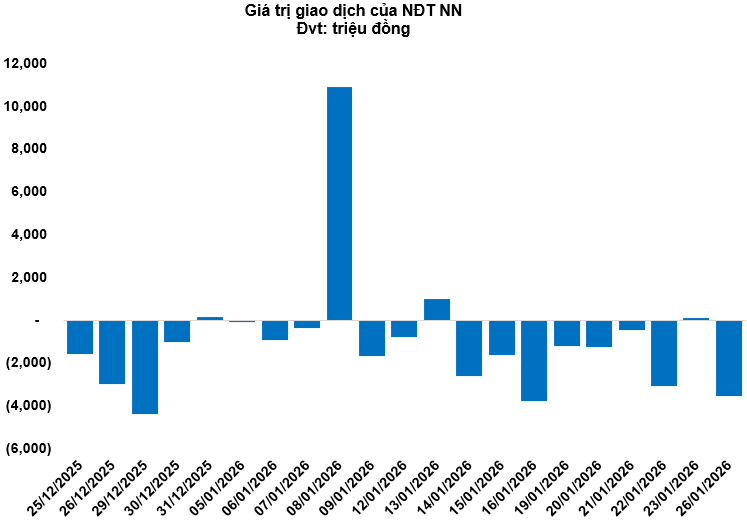 Kết thúc phiên giao dịch ngày 26/01/2026, toàn thị trường có 34 mã tăng, 263 mã giảm và 26 mã tham chiếu. Khối ngoại quay lại bán ròng với tổng mức bán ròng đạt 3.53 tỷ đồng.