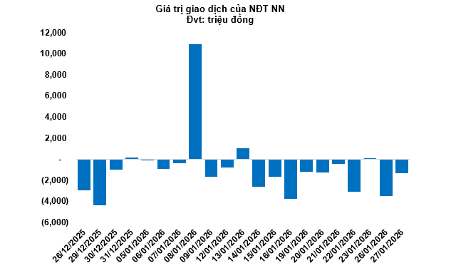 Kết thúc phiên giao dịch ngày 27/01/2026, toàn thị trường có 93 mã tăng, 187 mã giảm và 43 mã tham chiếu. Khối ngoại tiếp tục bán ròng với tổng mức bán ròng đạt 1.34 tỷ đồng.