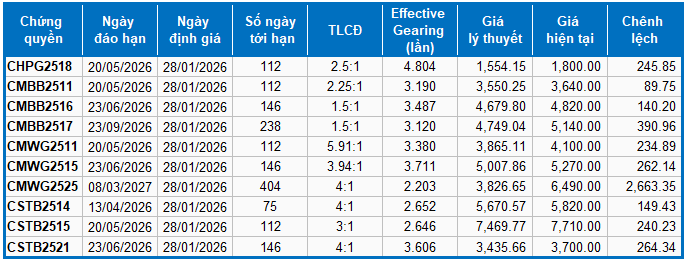 Thị trường chứng quyền ngày 28/01/2026: Thị trường diễn biến phân hóa