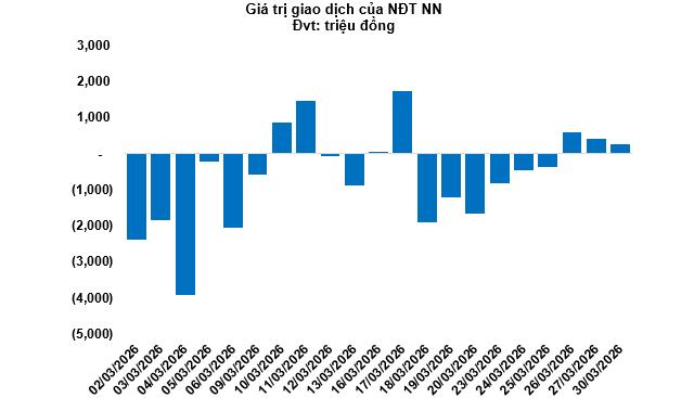 Kết thúc phiên giao dịch ngày 30/03/2026, toàn thị trường có 74 mã tăng, 171 mã giảm và 37 mã tham chiếu. Khối ngoại tiếp tục mua ròng với tổng mức mua ròng đạt 261.12 triệu đồng.