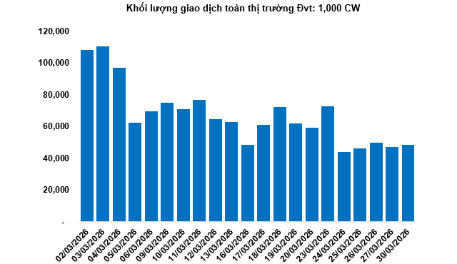 Khối lượng giao dịch toàn thị trường trong phiên 30/03 đạt 48.46 triệu CW, tăng 3.21%; giá trị giao dịch đạt 48.5 tỷ đồng, tăng 4.45% so với phiên 27/03. Trong đó, CVRE2601 là mã dẫn đầu thị trường về khối lượng với 2.5 triệu CW; CMWG2524 dẫn đầu về giá trị giao dịch với 2.27 tỷ đồng.