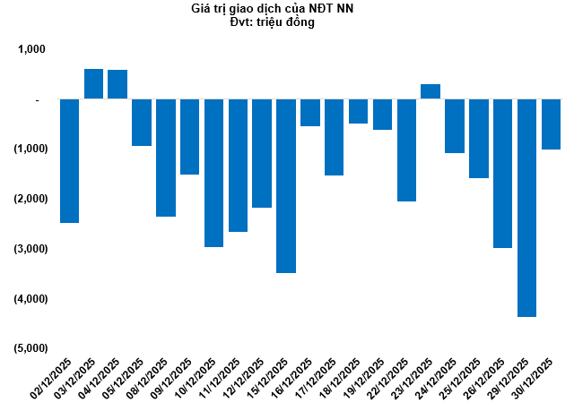 Kết thúc phiên giao dịch ngày 30/12/2025, toàn thị trường có 121 mã tăng, 112 mã giảm và 26 mã tham chiếu. Khối ngoại tiếp tục bán ròng với tổng mức bán ròng đạt 1.01 tỷ đồng.