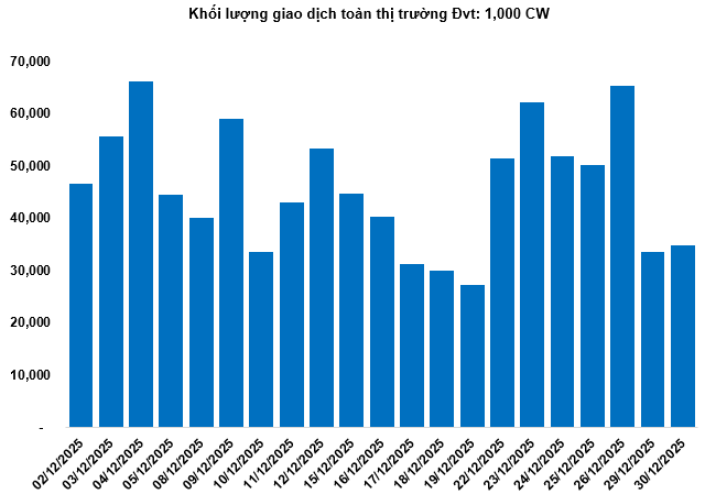 Khối lượng giao dịch toàn thị trường trong phiên 30/12 đạt 34.73 triệu CW, tăng 3.9%; giá trị giao dịch đạt 69.67 tỷ đồng, tăng 15.6% so với phiên 29/12. Trong đó, CVPB2516 là mã dẫn đầu thị trường về khối lượng với 1.06 triệu CW; CSTB2515 dẫn đầu về giá trị giao dịch với 5.55 tỷ đồng.