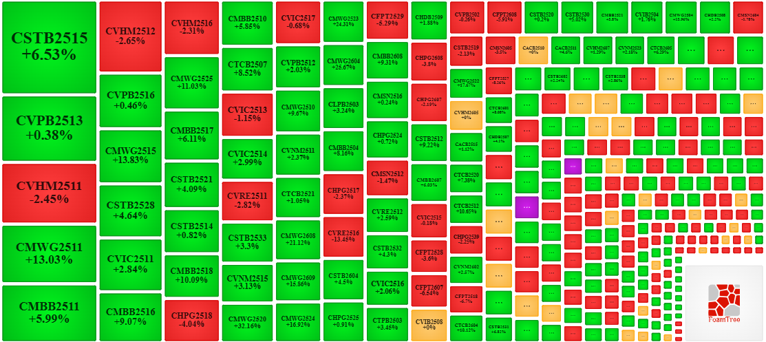Trong phiên giao dịch ngày 30/01/2025, thị trường diễn biến phân hóa nhưng bên mua có phần lấn lướt hơn khiến phần lớn các mã chứng quyền tăng giá. Cụ thể, các mã chứng quyền lớn trong nhóm tăng giá là CSTB2515, CVPB2513, CMWG2511 và CMBB2511.