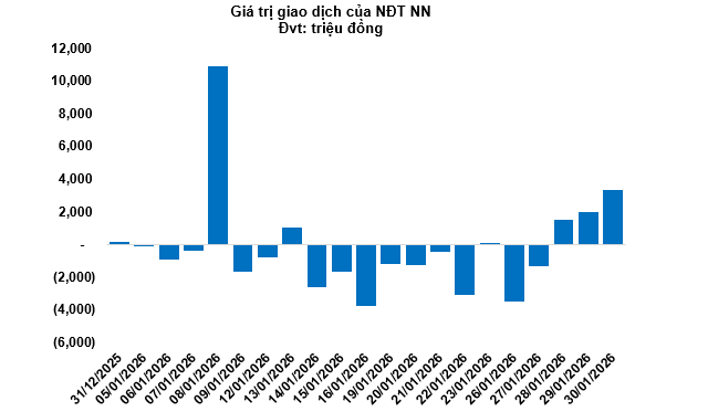 Kết thúc phiên giao dịch ngày 30/01/2026, toàn thị trường có 170 mã tăng, 120 mã giảm và 33 mã tham chiếu. Khối ngoại tiếp tục mua ròng với tổng mức mua ròng đạt 3.34 tỷ đồng.