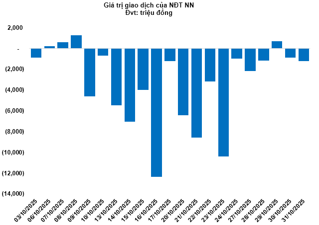 Kết thúc phiên giao dịch ngày 31/10/2025, toàn thị trường có 24 mã tăng, 198 mã giảm và 31 mã tham chiếu. Khối ngoại tiếp tục bán ròng với tổng mức bán ròng đạt 1.21 tỷ đồng.