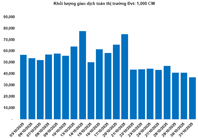Khối lượng giao dịch toàn thị trường trong phiên 31/10 đạt 36.96 triệu CW, giảm 9.91%; giá trị giao dịch đạt 92.7 tỷ đồng, giảm 7.94% so với phiên 30/10. Trong đó, CFPT2512 là mã dẫn đầu thị trường về khối lượng với 2.07 triệu CW; CVRE2407 dẫn đầu về giá trị giao dịch với 8.09 tỷ đồng.