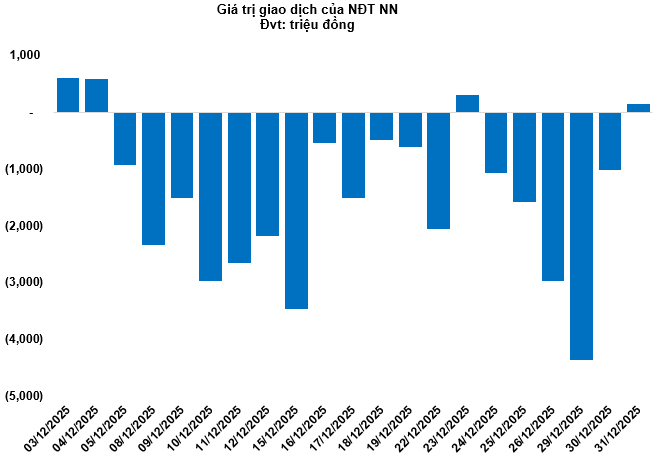 Kết thúc phiên giao dịch ngày 31/12/2025, toàn thị trường có 101 mã tăng, 118 mã giảm và 39 mã tham chiếu. Khối ngoại quay lại mua ròng với tổng mức mua ròng đạt 142.17 triệu đồng.