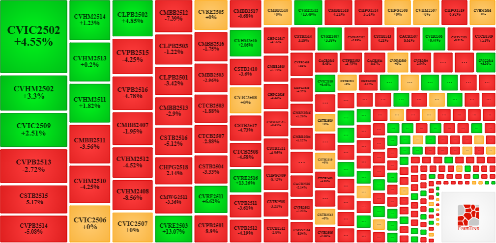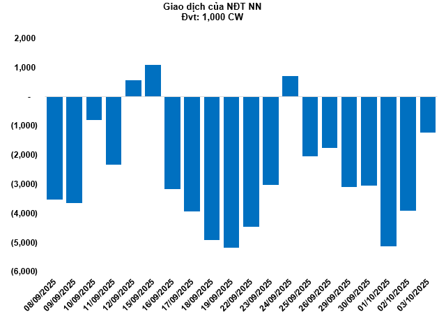 Khối ngoại tiếp tục bán ròng trong phiên 03/10 với tổng mức bán ròng đạt 1.23 triệu CW. Trong đó, CMSN2509CMSN2510 là hai mã bị bán ròng nhiều nhất. Tính cho cả tuần, khối ngoại bán ròng hơn 16.39 triệu CW.