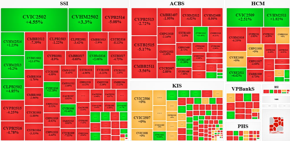 Trong phiên giao dịch ngày 03/10/2025, bên bán tiếp tục dẫn dắt thị trường khiến phần lớn các mã chứng quyền giảm giá. Cụ thể, các mã chứng quyền lớn trong nhóm giảm giá là CVPB2513, CSTB2515, CVHM2510 và CMBB2407.