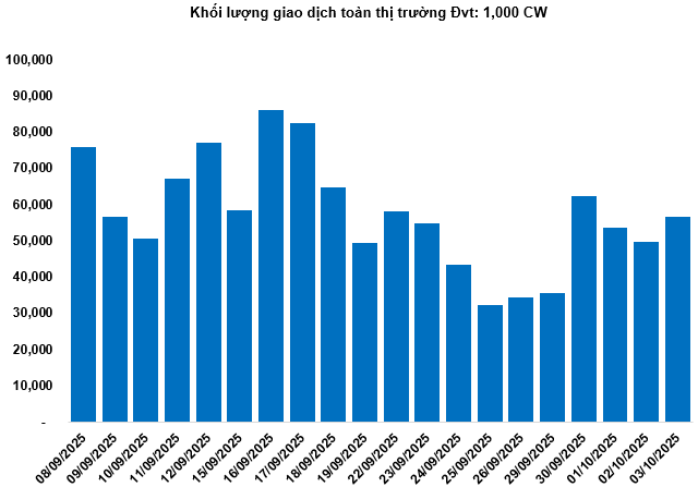 Khối lượng giao dịch toàn thị trường trong phiên 03/10 đạt 56.54 triệu CW, tăng 13.78%; giá trị giao dịch đạt 141.44 tỷ đồng, tăng 10.88% so với phiên 02/10. Trong đó, CHPG2520 là mã dẫn đầu thị trường về khối lượng và giá trị giao dịch, với tổng khối lượng đạt 4.78 triệu CW, tương đương giá trị 14.7 tỷ đồng.