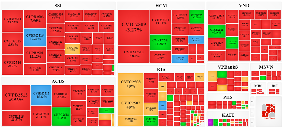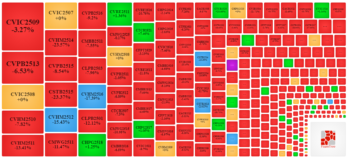 Trong phiên giao dịch ngày 07/11/2025, bên bán tiếp tục áp đảo thị trường khiến phần lớn các mã chứng quyền giảm giá. Cụ thể, các mã chứng quyền lớn trong nhóm giảm giá là CVIC2509, CVPB2513, CVHM2510, CVHM2511 và CSTB2515.