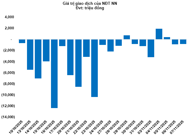 Kết thúc phiên giao dịch ngày 07/11/2025, toàn thị trường có 27 mã tăng, 250 mã giảm và 24 mã tham chiếu. Khối ngoại tiếp tục bán ròng với tổng mức bán ròng đạt 874.33 triệu đồng.