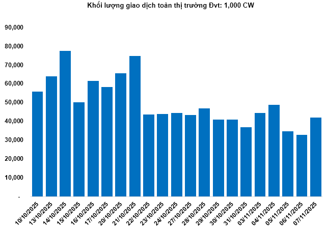 Khối lượng giao dịch toàn thị trường trong phiên 07/11 đạt 41.93 triệu CW, tăng 27.98%; giá trị giao dịch đạt 99.3 tỷ đồng, tăng 46.28% so với phiên 06/11. Trong đó, CVHM2514 là mã dẫn đầu thị trường về khối lượng với 1.87 triệu CW; CVHM2512 dẫn đầu về giá trị giao dịch với 10.72 tỷ đồng.